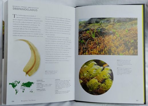 The main body of the book is divided into sections on the hornworts, liverworts and mosses, with a single or double-page spread devoted to one or more genera from every order. These genus profiles include a box with a distribution map, etymology, number of species, appearance and habitat. The accompanying text and photographs of particular species within the genus highlight characteristic and interesting features.