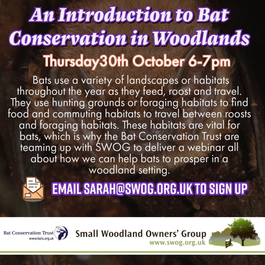 Join us for our Halloween special, An Introduction to Bat Conservation in Woodlands, on Thursday 30th Oct at 6 pm. We’re teaming up with the Bat Conservation Trust to bring you what is certain to be an informative webinar all about how we can help bats to prosper in a woodland setting. No tricks, just treats in this free event. Call Sarah on her batphone or even better, follow the link or email Sarah to register.