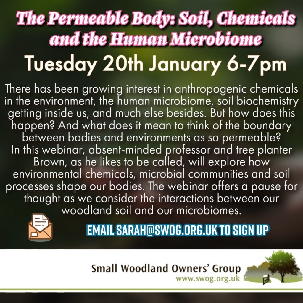 Please join us for The Permeable Body: Soil, Chemicals and the Human Microbiome on Tues 20th Jan at 6 pm. In what is certain to be a thought-provoking webinar, Brown will explore how environmental chemicals, microbial communities and soil processes shape our bodies. Follow the link or email Sarah to register.